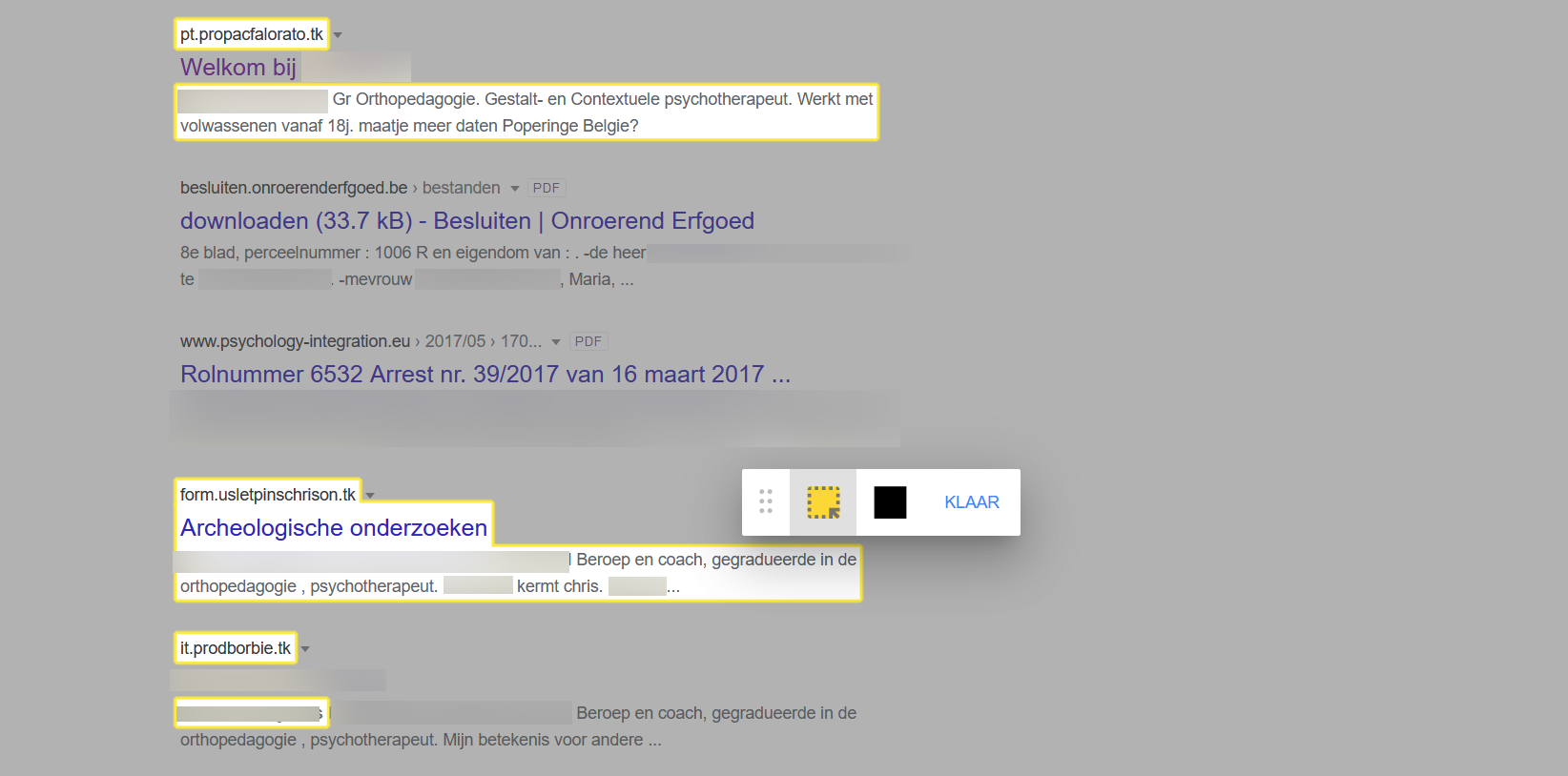 Zie je jezelf ongevraagd op een .be site staan, dan kan je met een grote kans op succes deze website contacteren en gewoon mailen om jouw gegevens te verwijderen. Gaat het over sites met een vreemde extentie (zoals .tk, .ml, .gq,…) dan kan je zelf één en ander ondernemen om dergelijke websites te signaleren bij Google.