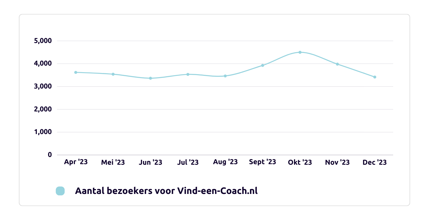 Sinds de opstart in mei 2020 groeit Vind-een-Coach.nl aan sneltempo. We bereikten op recordtijd meer dan 4.000 bezoekers per maand op onze website. Op deze manier gaan we Vind-een-Therapeut.nl gemakkelijk achterna!